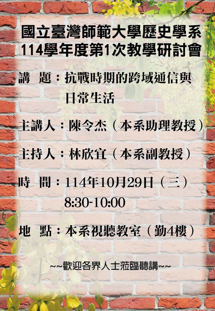 【教學研討會】114-1次114.10.29 (三)陳令杰老師:抗戰時期的跨域通信與日常生活 114學年度第1次教學研討會講 題:抗戰時期的跨域通信與日常生活主講人:陳令杰老師(本系助理教授)主持人:林欣宜老師(本系副教授)時 間:2025年10月29日(三) 8:30-10:00地 點:本系視聽教室 ~歡迎各界人士蒞臨聽講~ Post author:李 文珠 Post published:2025-10-03