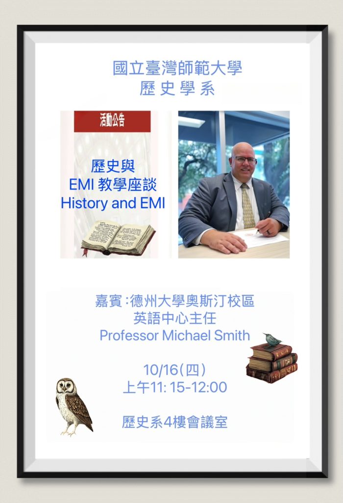 【EMI活動】2025.10.16 歷史與EMI教學座談 History and EMI(嘉賓:德州大學奧斯汀校區英語中心主任 Prof. Michael Smith) 【EMI活動】 時間:2025年10月16日(四)11:15-12:00 地點:歷史系4樓會議室 嘉賓:Prof. Michael Smith(德州大學奧斯汀校區英語中心主任) Post author:安佳芸 Post published:2025-10-13