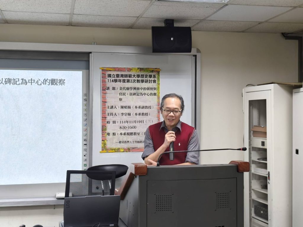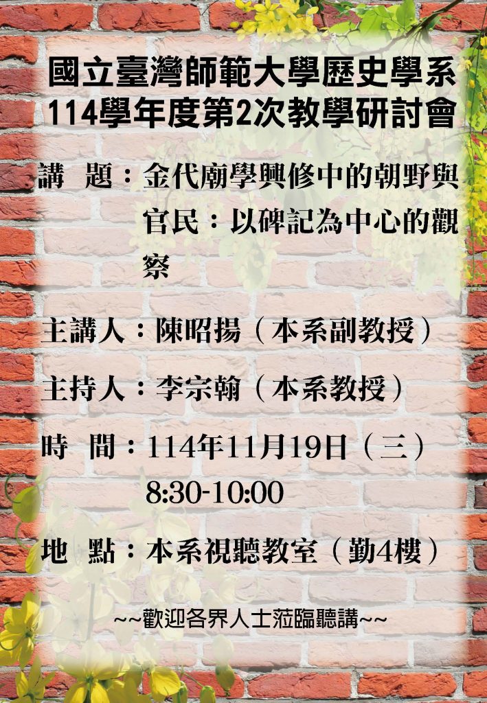 【教學研討會】114-2次114.11.19 (三)陳昭揚老師:金代廟學興修中的朝野與官民:以碑記為中心的觀察 114學年度第2次教學研討會講 題:金代廟學興修中的朝野與官民:以碑記為中心的觀察主講人:陳昭揚老師(本系副教授)主持人:李宗翰老師(本系教授)時 間:2025年11月19日(三) 8:30-10:00地 點:本系視聽教室 ~歡迎各界人士蒞臨聽講~ Post author:李 文珠 Post published:2025-10-28