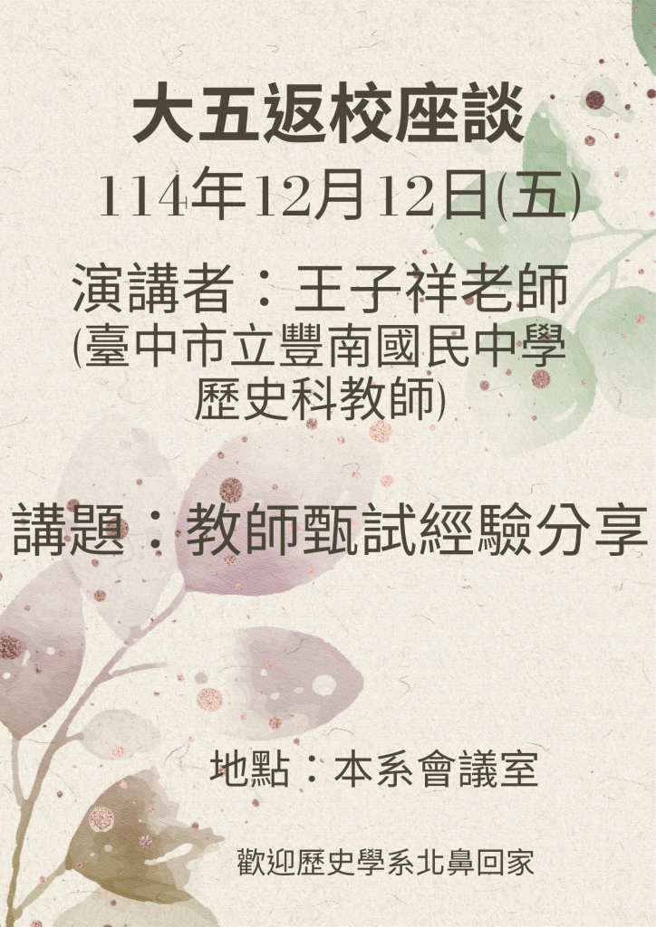 【返校座談】114-1-4次:114.12.12(五) 【大五返校座談】 場次:114年第1學期度第4次(12月份) 時間:114年12月12(五)09:30報到(各別組報到時間異動,請參看報到地點處或師長各組通知為準) 主持人:葉高樹老師、陳健文老師、陳昭揚老師教師甄試講座 時間:12月12日(五)上午10:00 地點:本系會議室主講人:王子祥老師(臺中市立豐南國民中學歷史科教師) 講 題: 教師甄試經驗分享 ※備註:報到地點及時間:(請9:30先於各組集合地點簽到)1.研究生第2教室(葉高樹老師組)2.本系會議室(陳健文老師組)3.研究生第1教室(陳昭揚老師組) 歷史學系辦公室 啟2025.12.03 Post author:王 美芳 Post published:2025-12-02