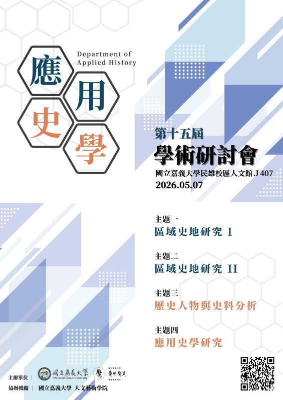 【公告】2026.5.7 國立嘉義大學應用歷史學系「2026年第十五屆應用史學學術研討會」 一、研討會時間:115年5月7日(星期四)。二、研討會地點:國立嘉義大學民雄校區人文館J407階梯教室。三、活動相關訊息請參閱本校應用歷史學系網頁或研討會網頁https://reurl.cc/6GvEX6。 Post author:李 文珠 Post published:2026-04-17